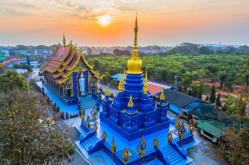 Pequeno-almoço. Em hora a combinar localmente, transfer para o aeroporto para embarque em voo com destino a Chiang Rai. Chegada e partida para o triângulo dourado, fronteira entre Tailândia, Laos e Myanmar, que foi durante anos o mais importante núcleo comercial do cultivo de ópio. Aprenda sobre cultura e história no Museu do Ópio e desfrute das vistas panorâmicas sobre o rio Mekong e os países vizinhos a partir do miradouro do Triângulo Dourado. Almoço. À tarde visita a umas espetaculares plantações de chá onde terá tempo para degustar chás da região ou desfrutar das vistas a partir da zona. Para finalizar, paragem no templo azul, que se destaca pela sua chamativa cor. Transfer para o hotel e alojamento.